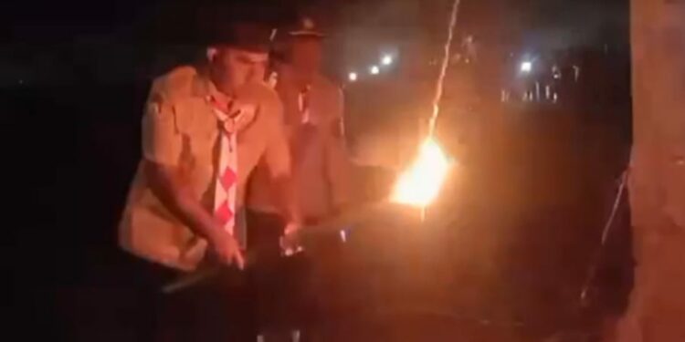 Ketua Kwarcab Pramuka Flores Timur, Agustinus Payong Boli menyalakan api unggun di Bumi Perkemahan Kapitan Lingga Desa Lamahala Jaya pada Minggu, 14 Agustus 2022 / Foto : BentaraNet