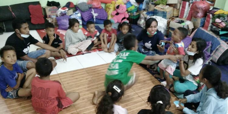 Lewoleba – Anak-anak penyintas banjir bandang dan longsor yang berada di posko pengungsian kantor Lurah Lewoleba Timur, Kabupaten Lembata tampak bahagia saat bermain bersama anggota Anak Muda Adonara Lembata (AMA Lembata) pada Rabu (16/7) malam.