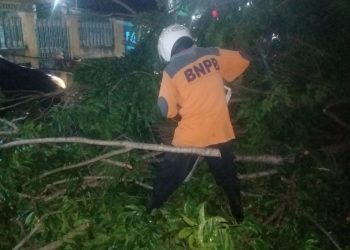 Maumere - Tim Reaksi Cepat (TRC) Badan Penanggulangan Bencana Daerah (BPBD) Kabupaten Sikka melakukan penanganan pohon tumbang di jalur Maumere-Ende...