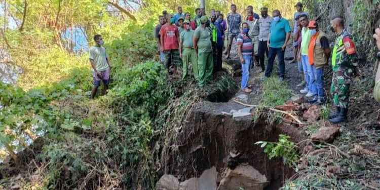 Plt Bupati Lembata, Thomas Ola Langoday (keenam dari kanan) memantau ruas jalan putus antara Desa Idalolong dan Warawutung, Kecamatan Nubatukan, Kabupaten Lembata pada Minggu (5/9/2021) pagi / Sumber Foto : Facebook Firman Ama Pureklolon