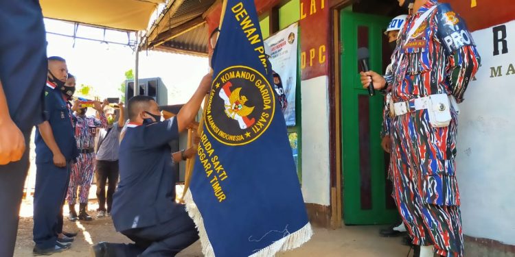 Ketua DPC LAI KGS Kabupaten TTS, Andi Seir E Taniu (berjongkok) saat menerima bendera LAI KGS (Foto Kukhau: Joe/BentaraNet)
