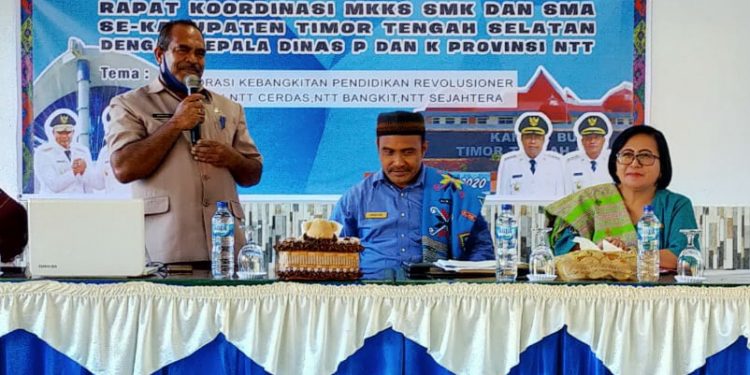 Hadir dalam rapat koordinasi MKKS SMK dan SMA se Kabupaten Timor Tengah Selatan (TTS) dengan Kepala Dinas Pendidikan dan Kebudayaan Provinsi Nusa Tenggara Timur (NTT), Kepala Dinas P dan K Kabupaten TTS, Edison Sipa.